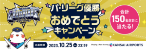 関西3空港を運営する関西エアポートは、オリックス・バファローズのパ・リーグ優勝を記念し、関西3空港で「オリックス・バファローズ パ・リーグ優勝おめでとうキャンペーン」を開催すると発表した。