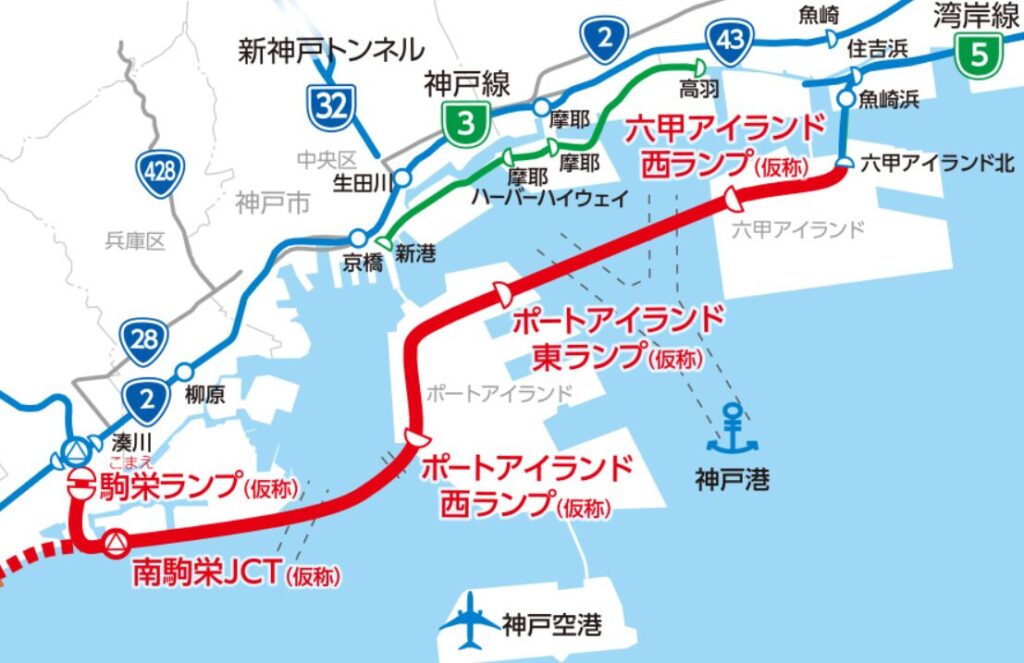 整備が進められている大阪湾岸道路西伸部。開通後は神戸空港から大阪・姫路方面へのアクセスが飛躍的に向上する。